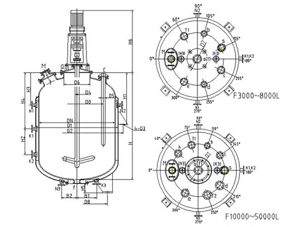 내부 설계 압력은 최대 1.0 MPa까지 가능하며, 용량은 3,000 L에서 50,000 L까지 다양하게 선택할 수 있습니다. 재킷은 최대 0.6 MPa의 압력에 맞게 설계되었으며, 탱크와 재킷 모두 –20 °C에서 200 °C까지의 온도 범위 내에서 안전하게 작동할 수 있습니다