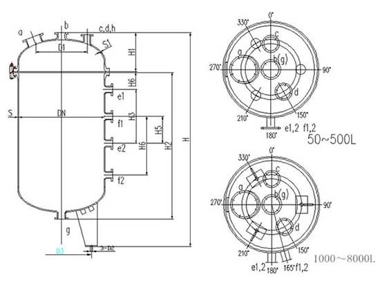 | 정격 용량 L | DN | D1 | D2 | D3 | H | H1 | H2 | H3 | H4 | S | H5 | H6 |