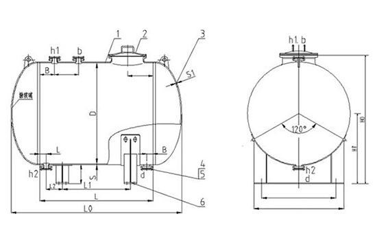 Nominal volume L | Actual volume L | Diameter | Tank | Head thickness S1 | Nominal diameter of nozzles (DN) 노즐의 공칭 직경 | Liquid level gauge length ×quantity |
