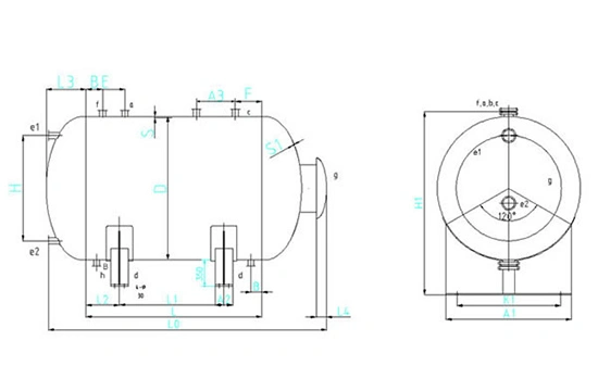 Tank wall thickness s | Length L | Spare nozzle a | Spare nozzle b | Spare nozzle c | Outlet nozzle d | Liquid level gauge e1, e2 | Inlet nozzle f | Outlet nozzle h | Process nozzle g |